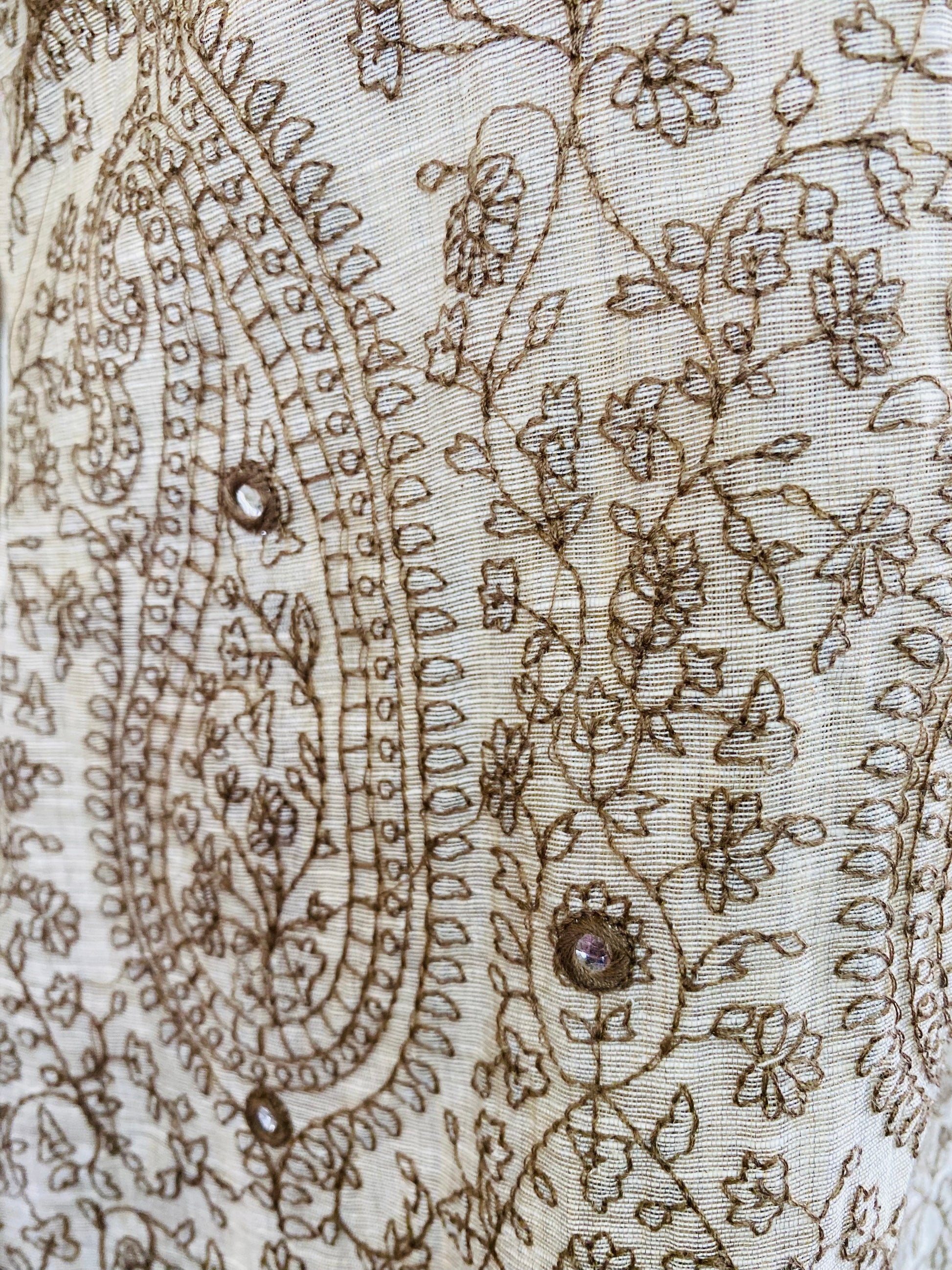 Experience the elegance of this Chanderi suit set featuring a straight-cut top and bottom with comfortable lining. The intricate jaal embroidery in paisley motifs adds a timeless, refined touch, while the soft organza contrast dupatta completes the look with delicate grace. Perfect for sophisticated occasions, this ensemble blends traditional craftsmanship with modern style.