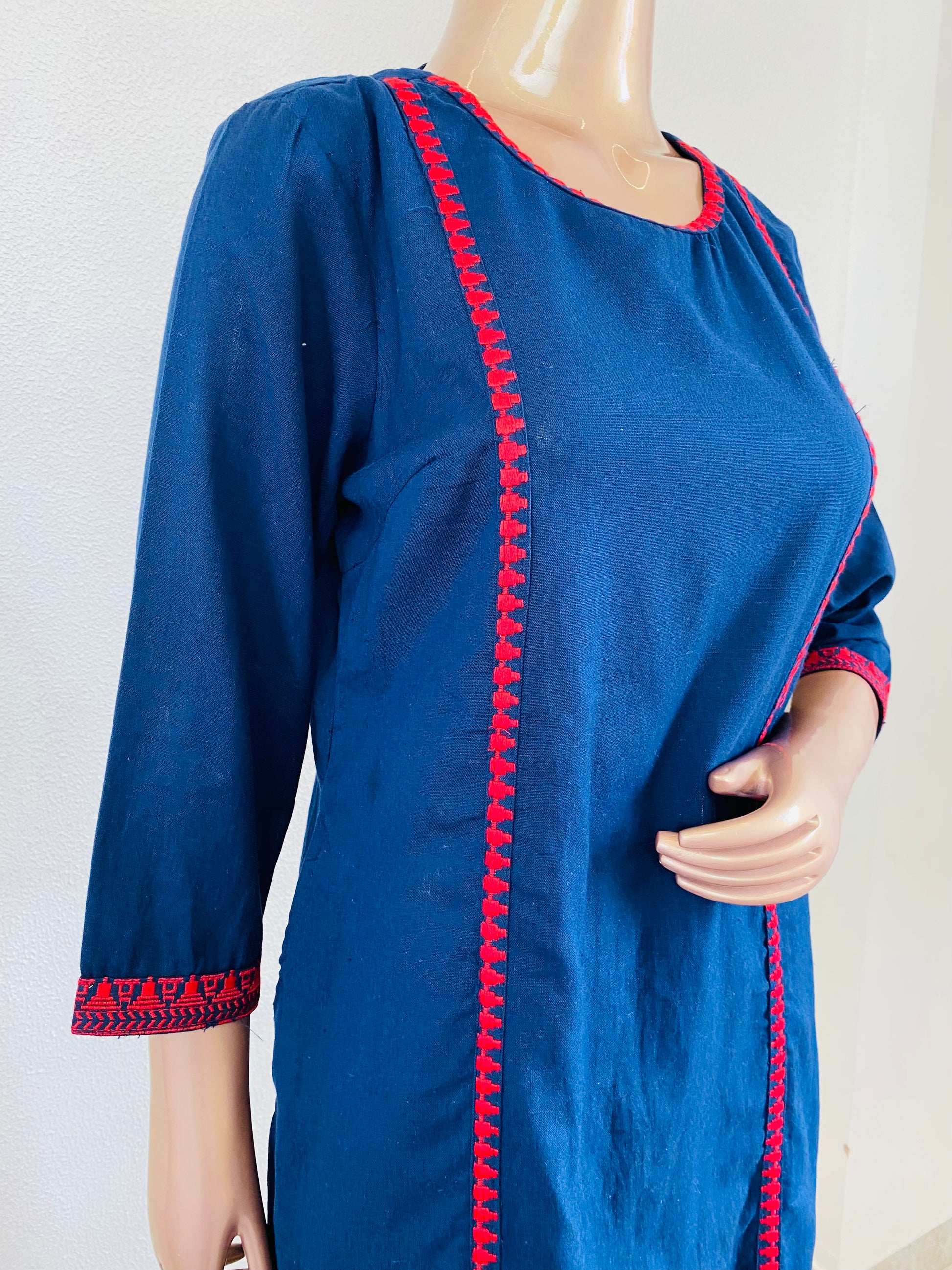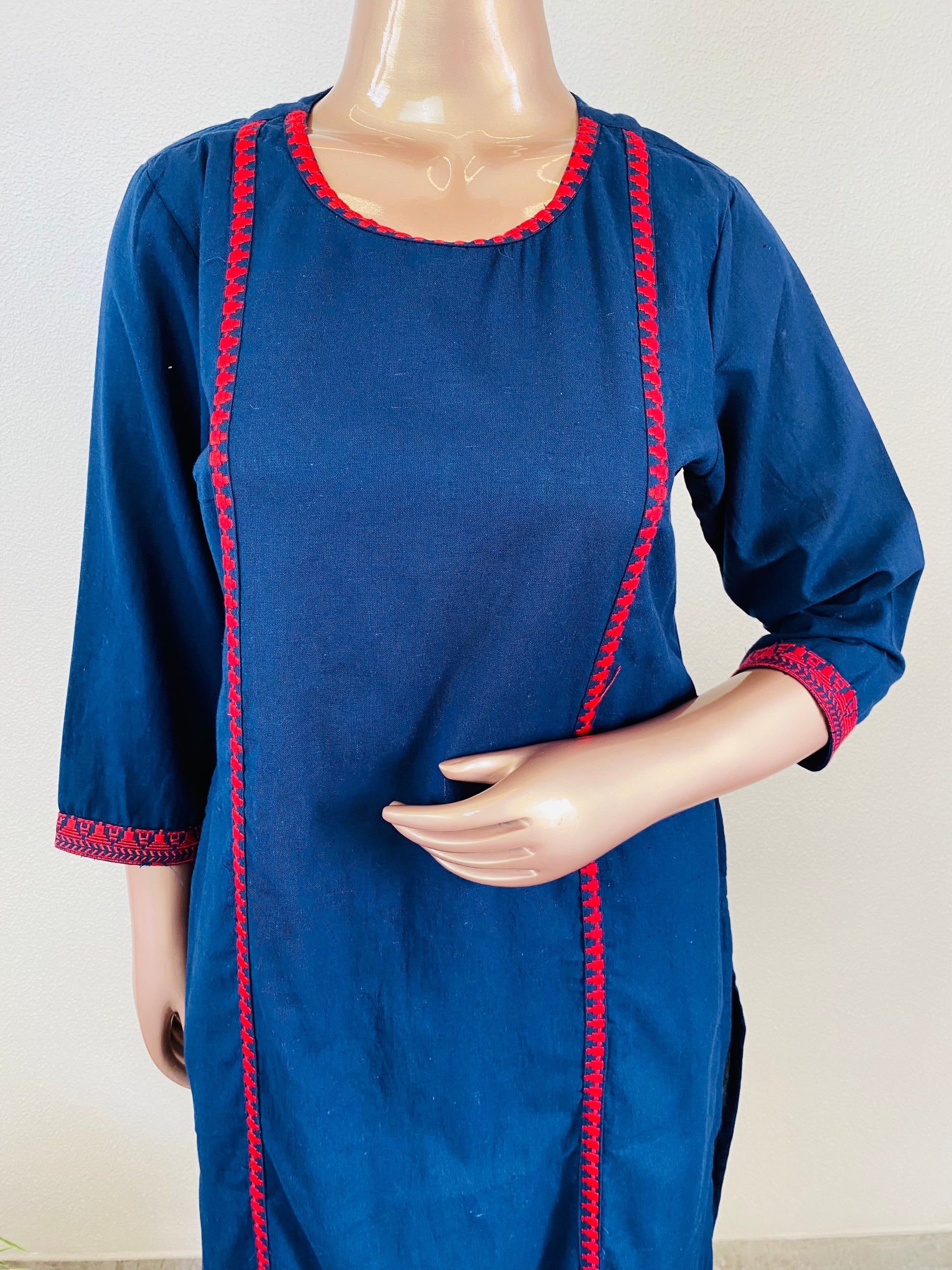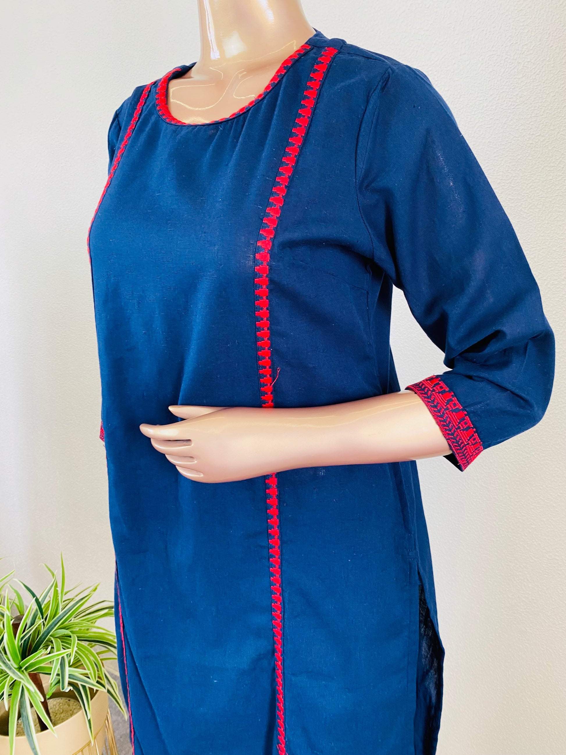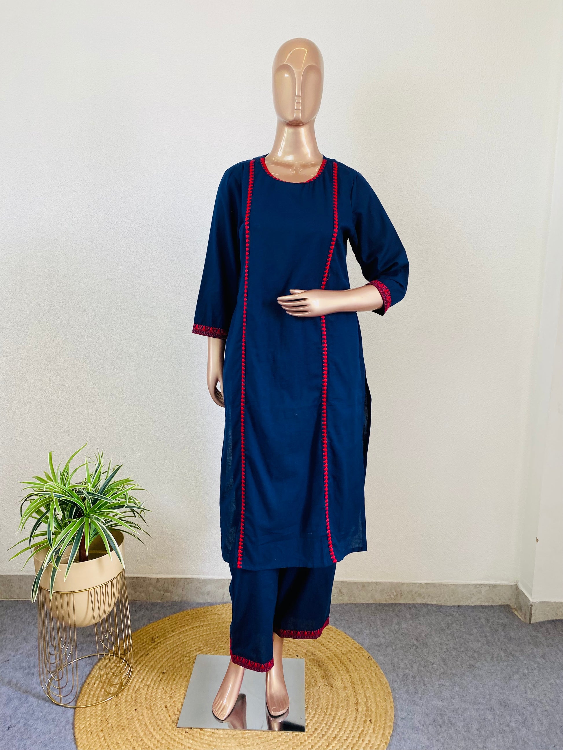 Crafted from breathable cotton flex fabric, this kurta and pant set features subtle contrast red weave piping that adds refined detail without overpowering. Its minimalist design makes it an excellent choice for office wear, blending comfort with understated elegance for a polished, professional look.