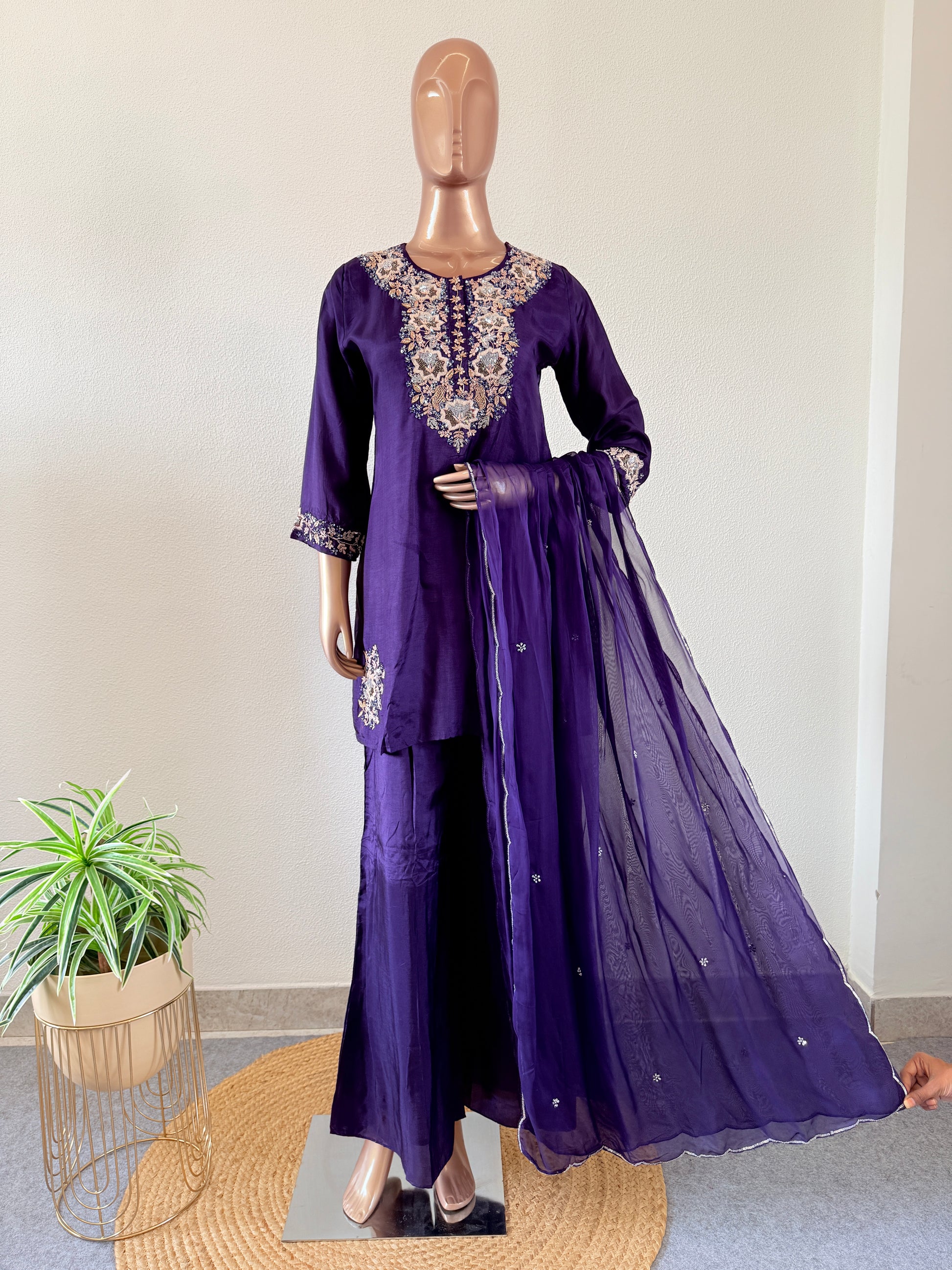 Elevate your ethnic wardrobe with this elegant Purple Dola Silk Short Kurta Suit Set. Crafted from pure dola silk, the kurta and palazzo feature intricate hand embroidery and are fully lined for comfort and a refined silhouette. Complemented by a soft organza dupatta adorned with delicate scalloped borders and meticulous handwork, this set offers a perfect blend of traditional craftsmanship and modern sophistication. Ideal for festive occasions and celebrations, it ensures you stand out with grace and style.