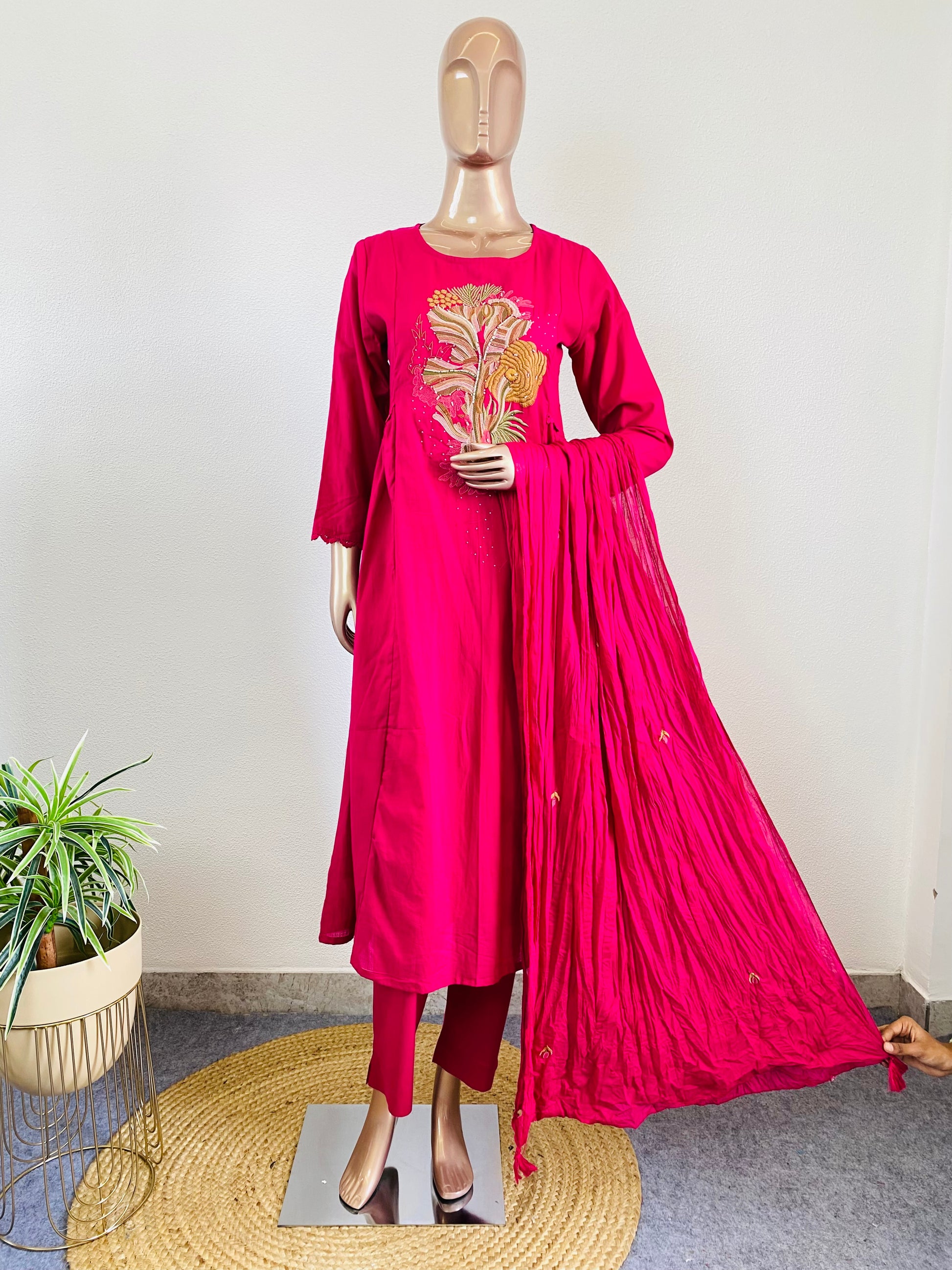 Elevate your wardrobe with this sophisticated A-line suit set crafted from soft silly cotton. Featuring exquisite abstract embroidery and elegant side gathers at the waist, it offers a flattering silhouette with refined detail. The ensemble is completed by a crushed mul cotton dupatta, adding a delicate texture and graceful finish to your look. Perfect for occasions where understated elegance meets comfort.