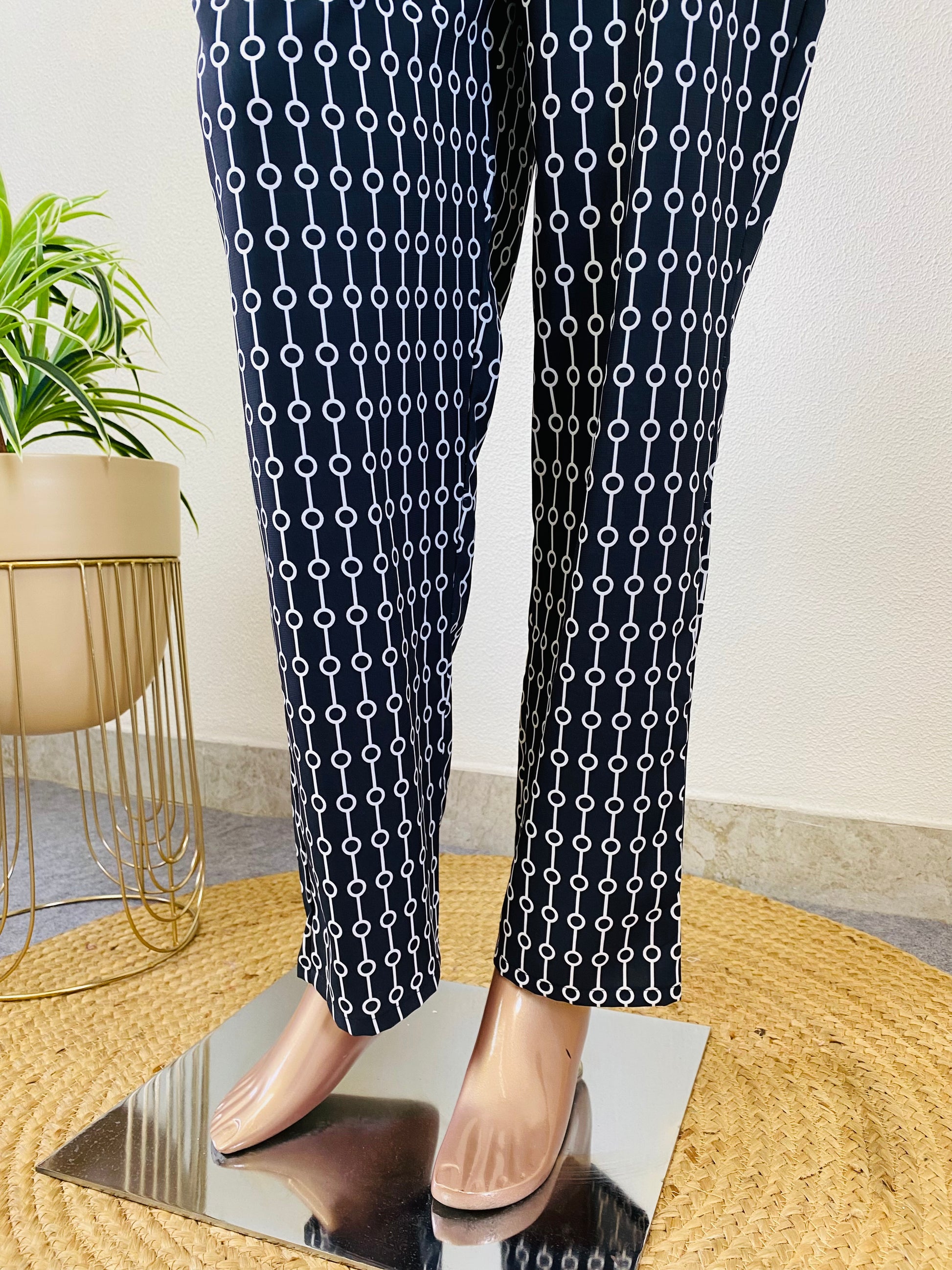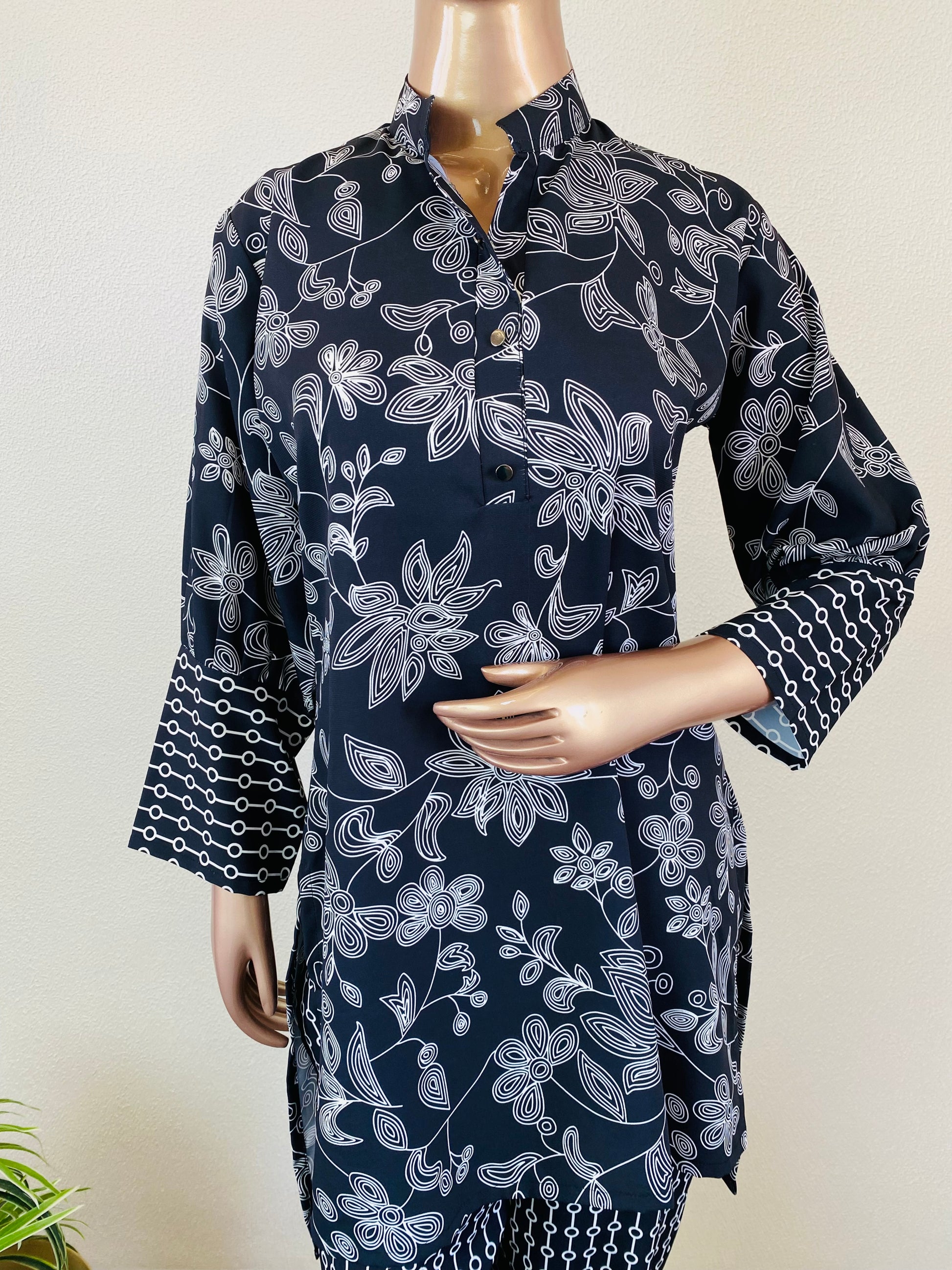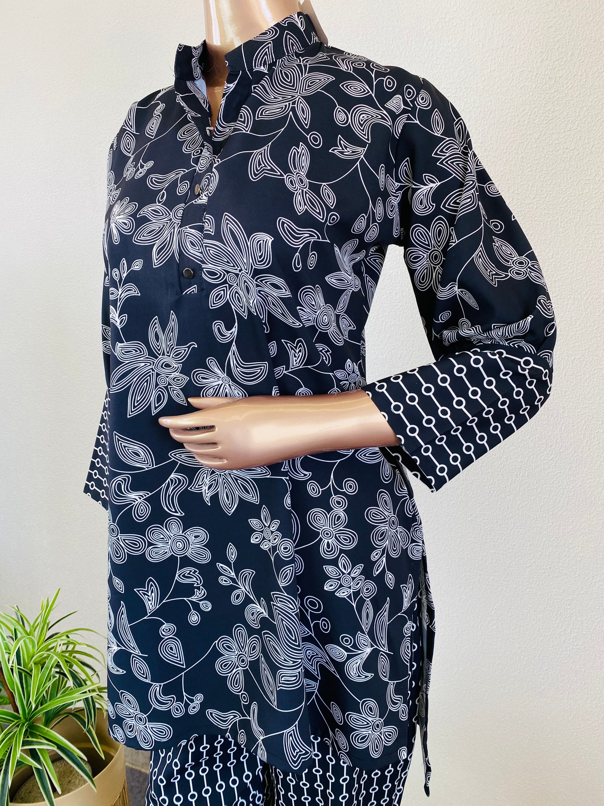 Elevate your wardrobe with this imported polyester coord set featuring a sophisticated blend of prints. The top showcases a delicate floral design with a stylish high-low hem, while the pants offer a contrasting geometric pattern for a modern edge. Perfect for making a refined statement with effortless comfort.