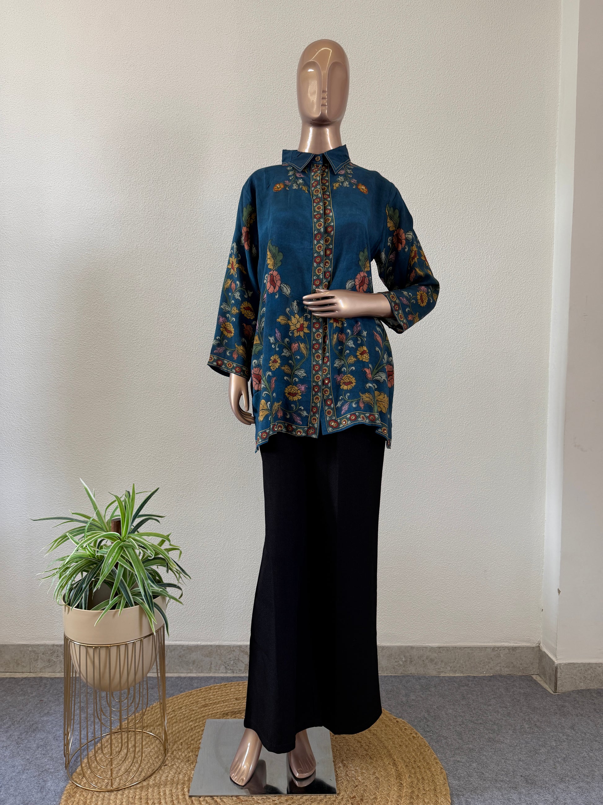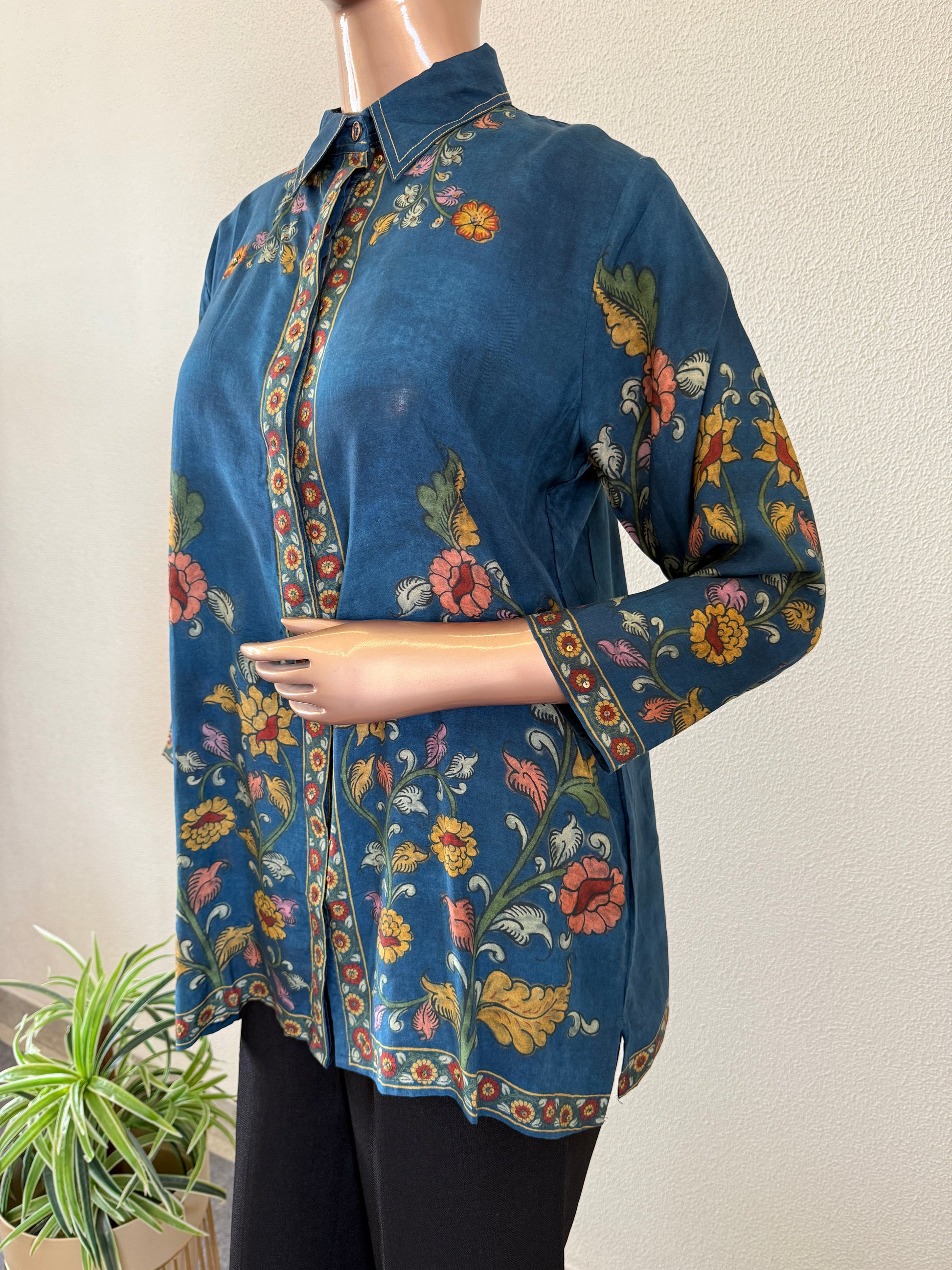 Kalamkari Print Muslin Shirt- Blue