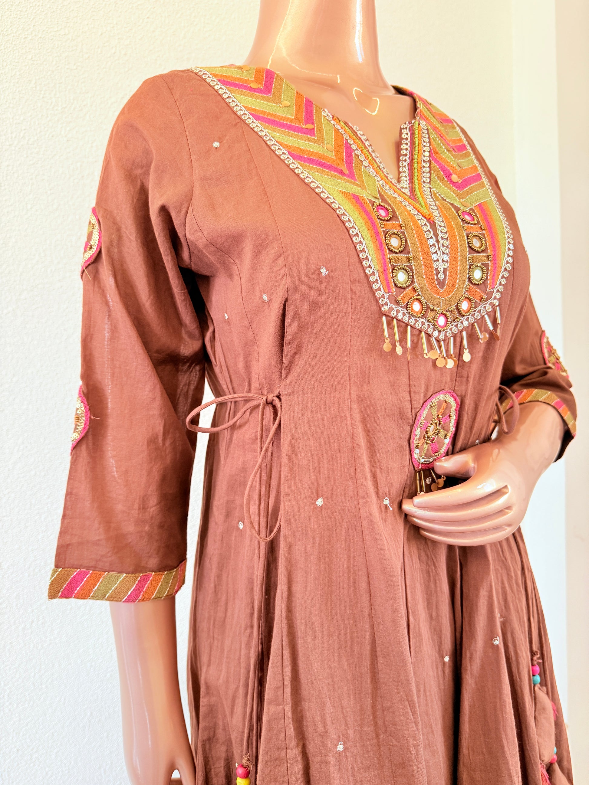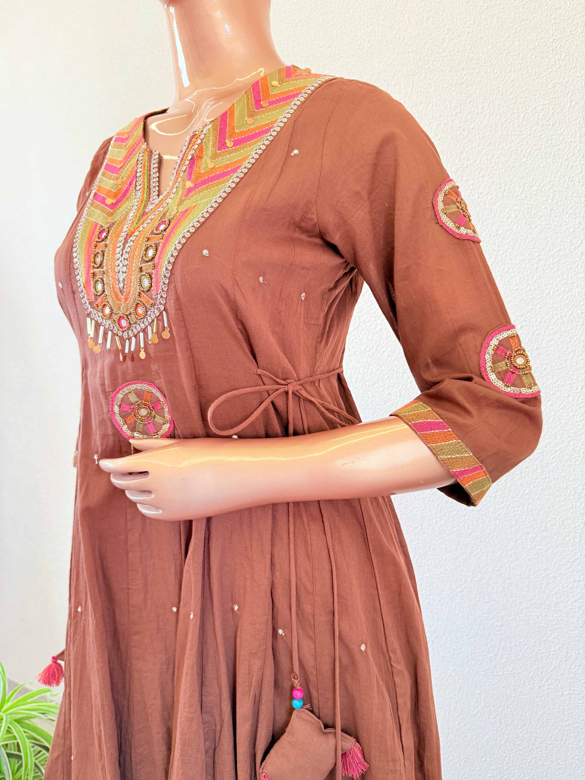 Mul Cotton Frock Suit with Heavy Neck Work - Brown