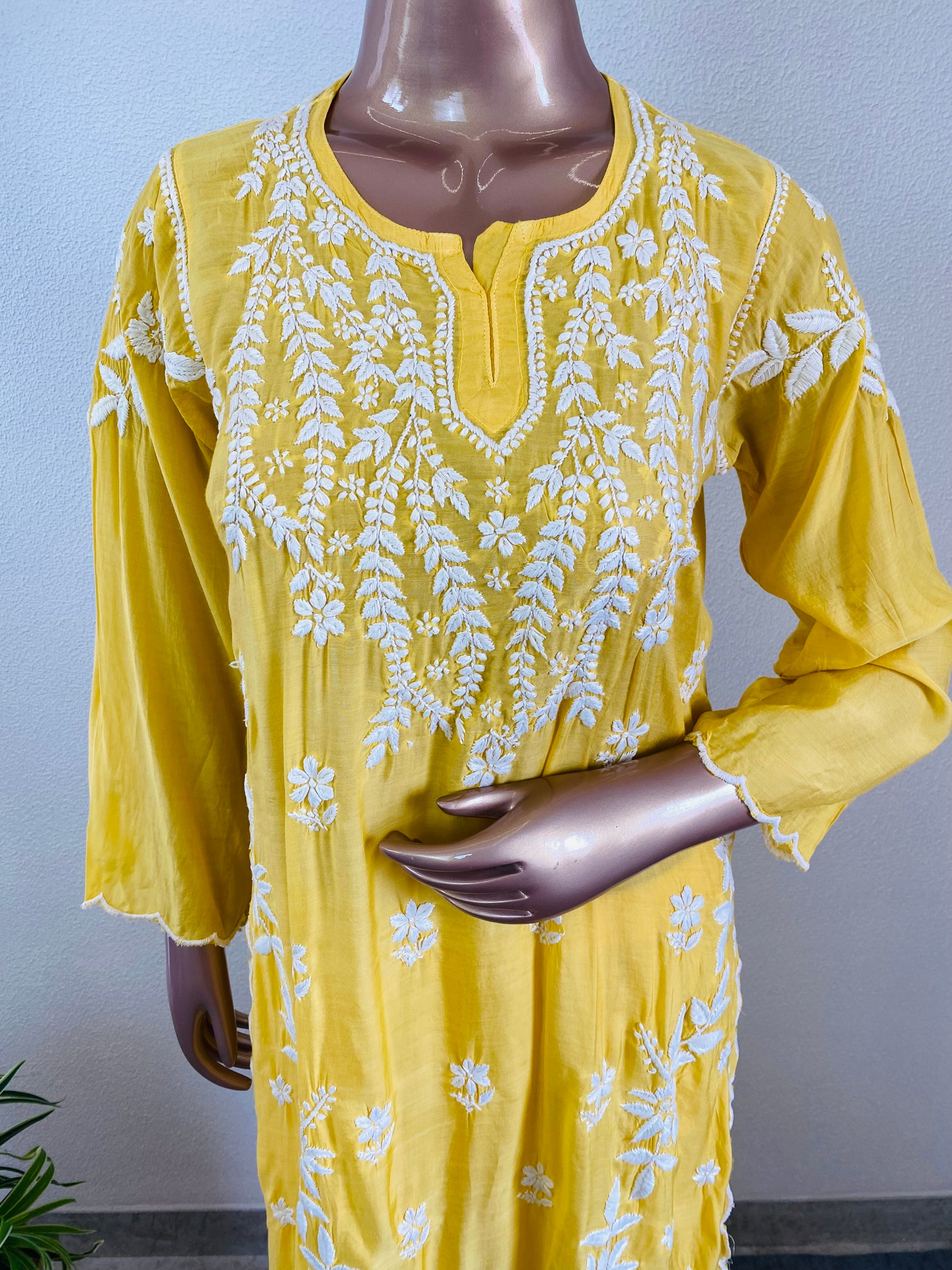 Elevate your ethnic wardrobe with this exquisite muslin sharara set, a timeless piece that seamlessly blends tradition with refined elegance. Adorned with intricate hand chikankari embroidery, each detail showcases meticulous craftsmanship and artisanal skill. The gracefully scalloped hemline adds a delicate finishing touch, while the lined sharara ensures comfort and confidence with every wear. Perfect for celebrations, festive occasions, or when you desire understated sophistication, this set embodies the essence of classic Indian fashion with contemporary sensibility.