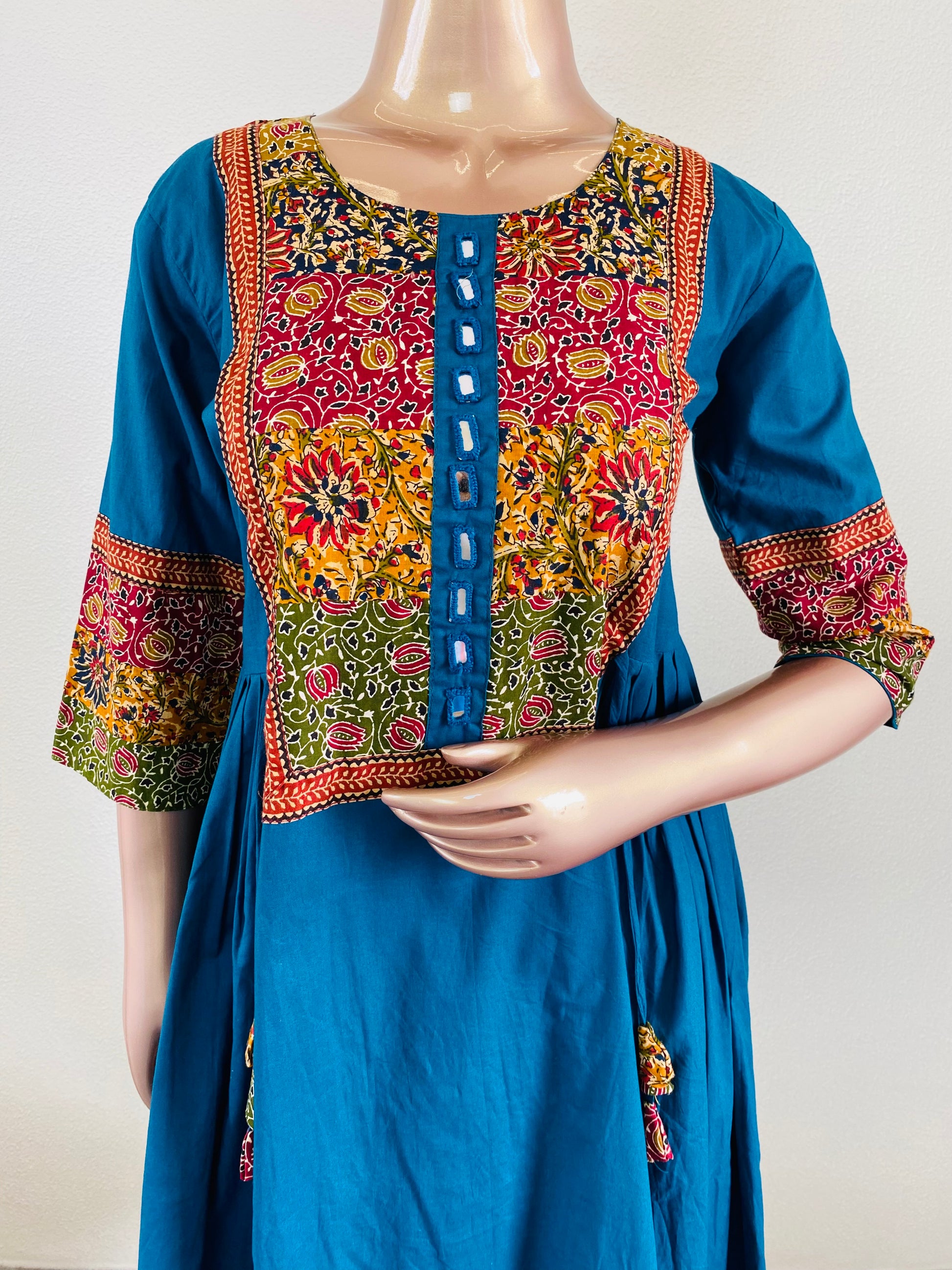 Experience timeless elegance with this Patch and Mirror Work Frock Kurta Pant Set. Crafted from pure cotton, the Gamthi-style frock kurta features intricate traditional fabric patchwork and authentic mirror embellishments, enhanced by delicate dori tassels at the waist. Paired with comfortable wide pants, this set offers a refined silhouette perfect for sophisticated occasions.