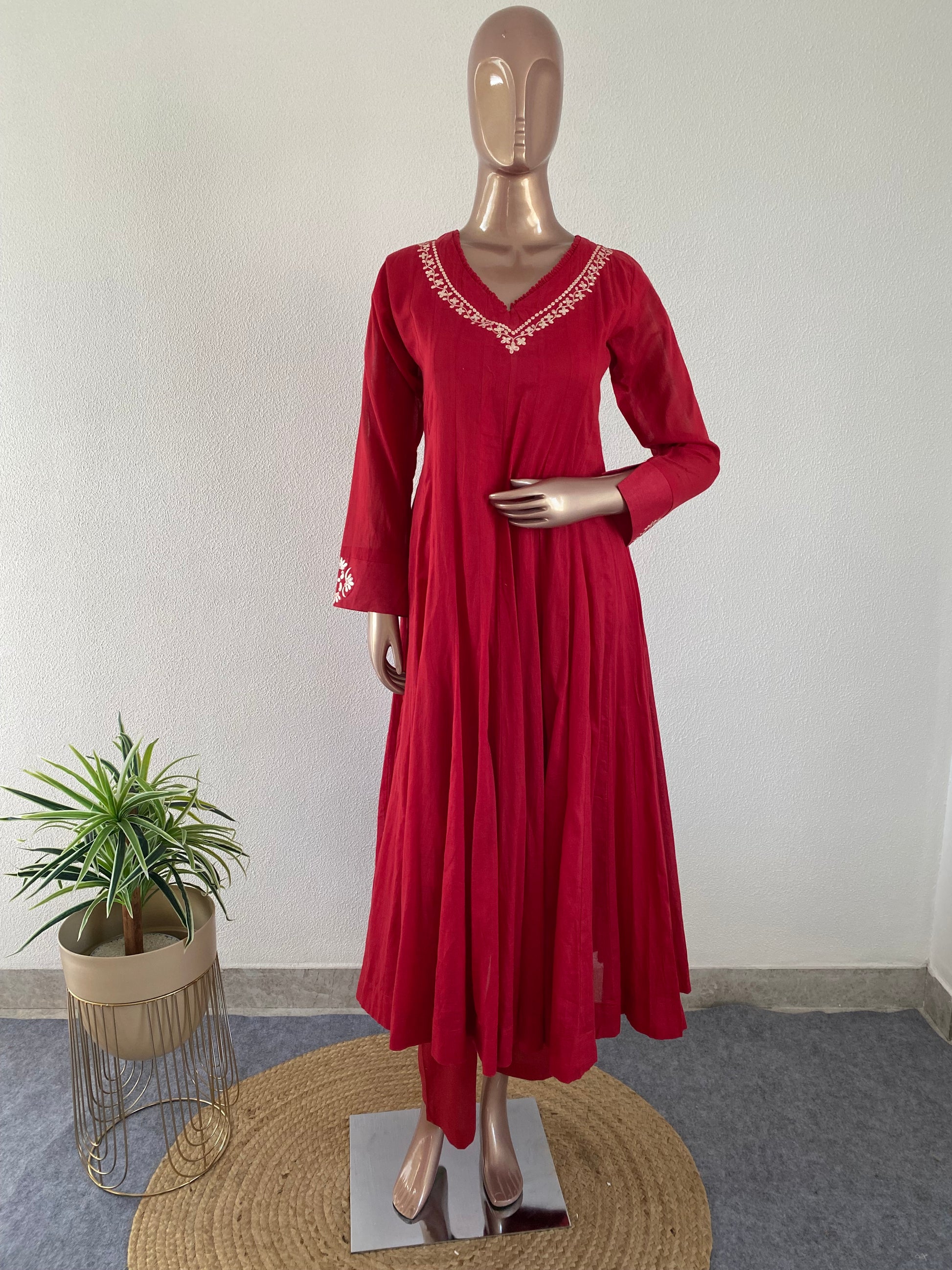 Pittan Work cotton Anarkali with Kota Doria Dupatta- Red