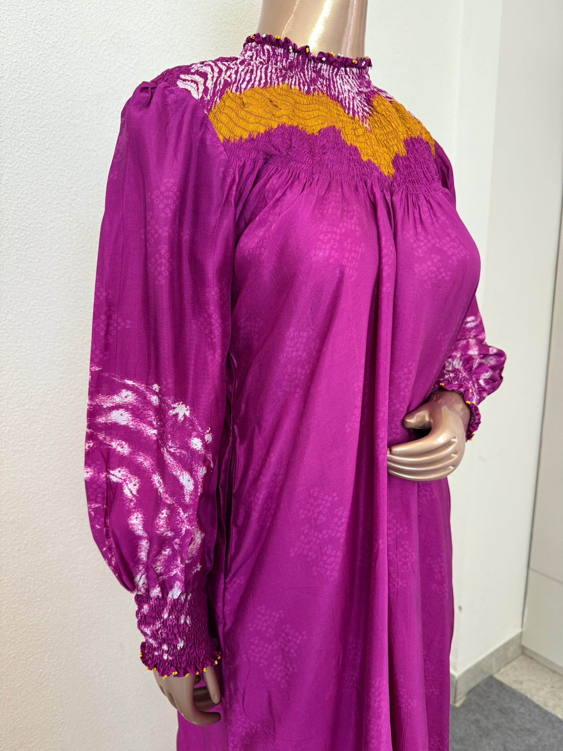 Embrace timeless elegance with this premium silk kurta pant set, a masterpiece of refined craftsmanship. Adorned with an intricate bandhani print in luxurious wine tones, this ensemble seamlessly blends traditional artistry with contemporary sophistication. The distinctive smoked neckline and cuffs elevate the silhouette with modern polish, while the generously cut wide-leg pants feature interior lining for effortless comfort and graceful drape. Ideal for festive celebrations, weddings, or moments when you seek to express cultural heritage through understated luxury.