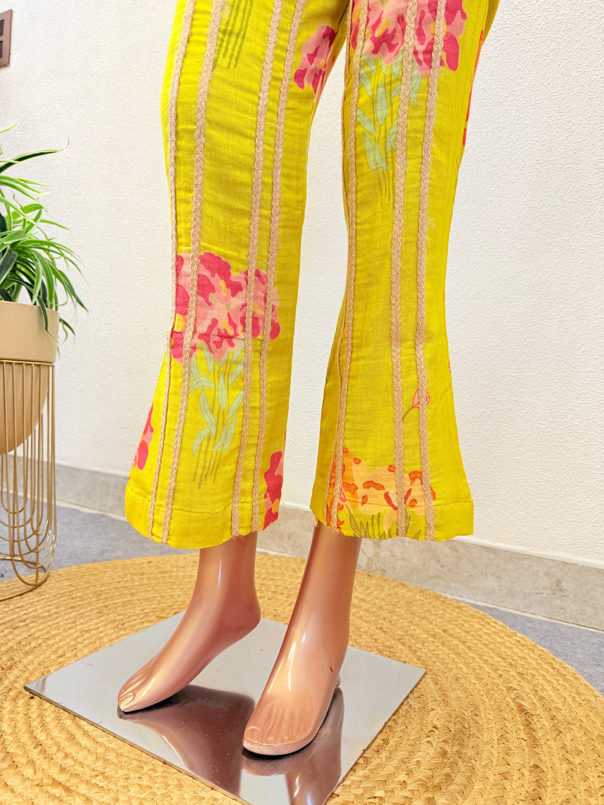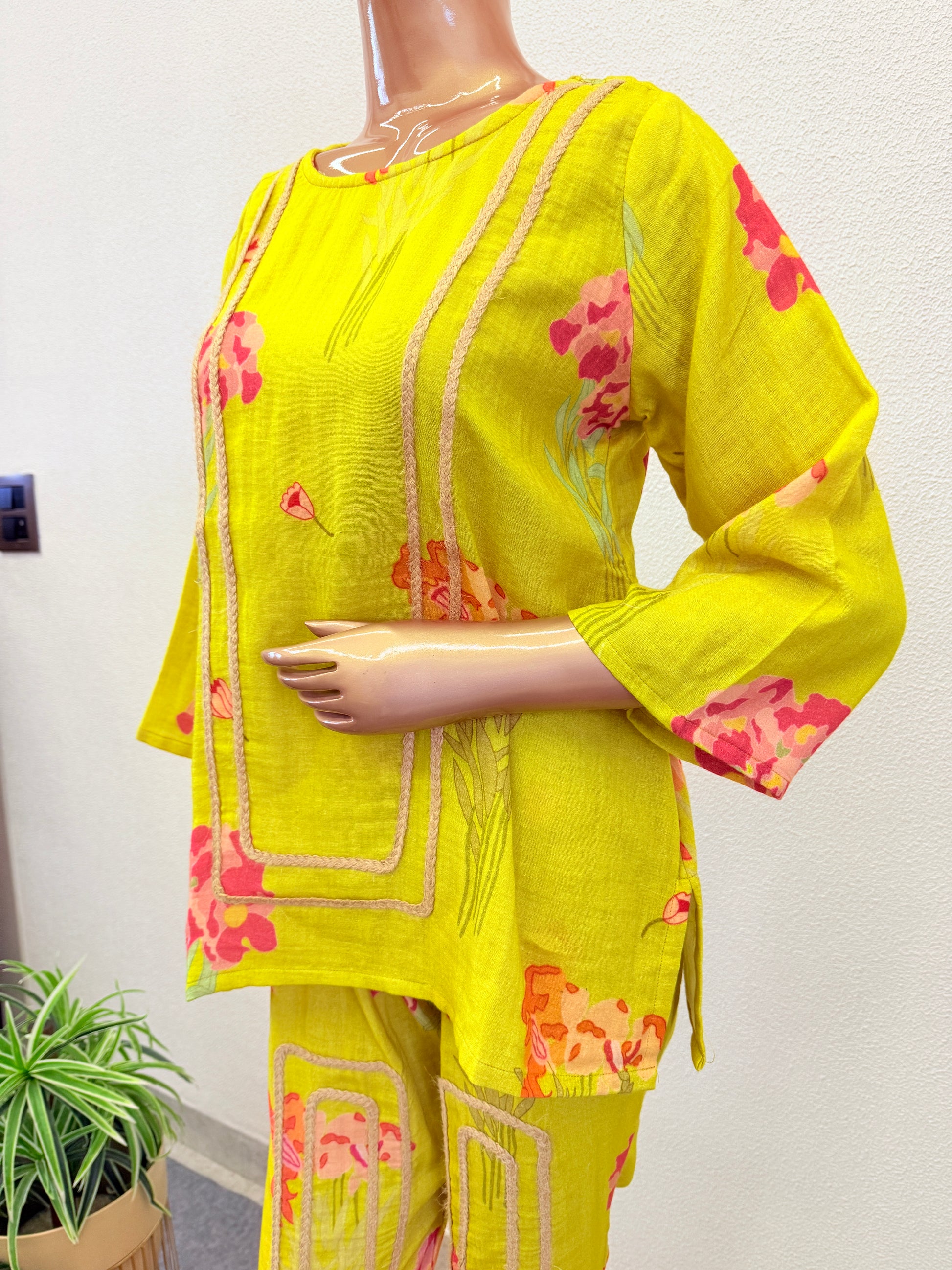 Elevate your wardrobe with this refined linen coordinate set, crafted from luxuriously soft pure mulberry linen. The ensemble features an enchanting floral digital print that captures contemporary elegance. Distinctive braided jute detailing adorns both the top and pants, adding artisanal texture and visual interest. Perfect for those who appreciate quality fabrics and thoughtful design, this set seamlessly transitions from casual gatherings to more polished occasions. The natural breathability of linen ensures comfort throughout the day, while the sophisticated color palette and intricate print make it a versatile addition to your collection.
