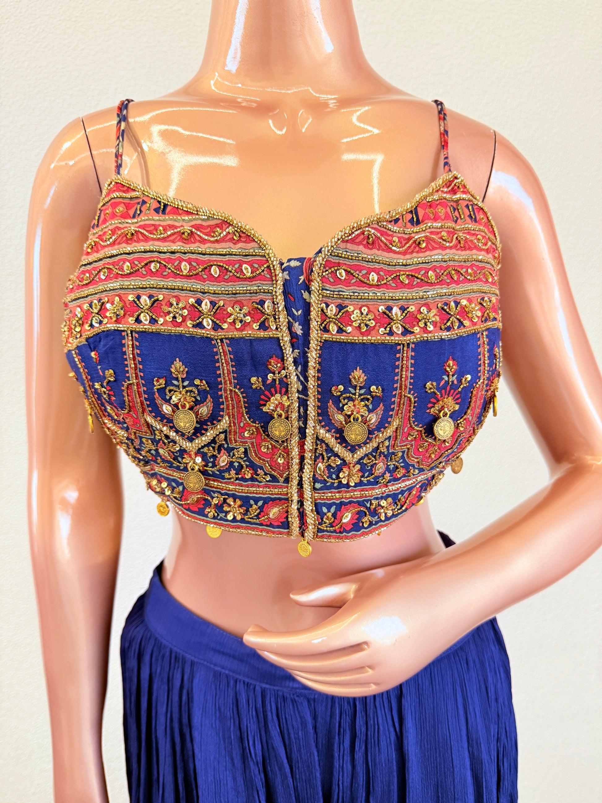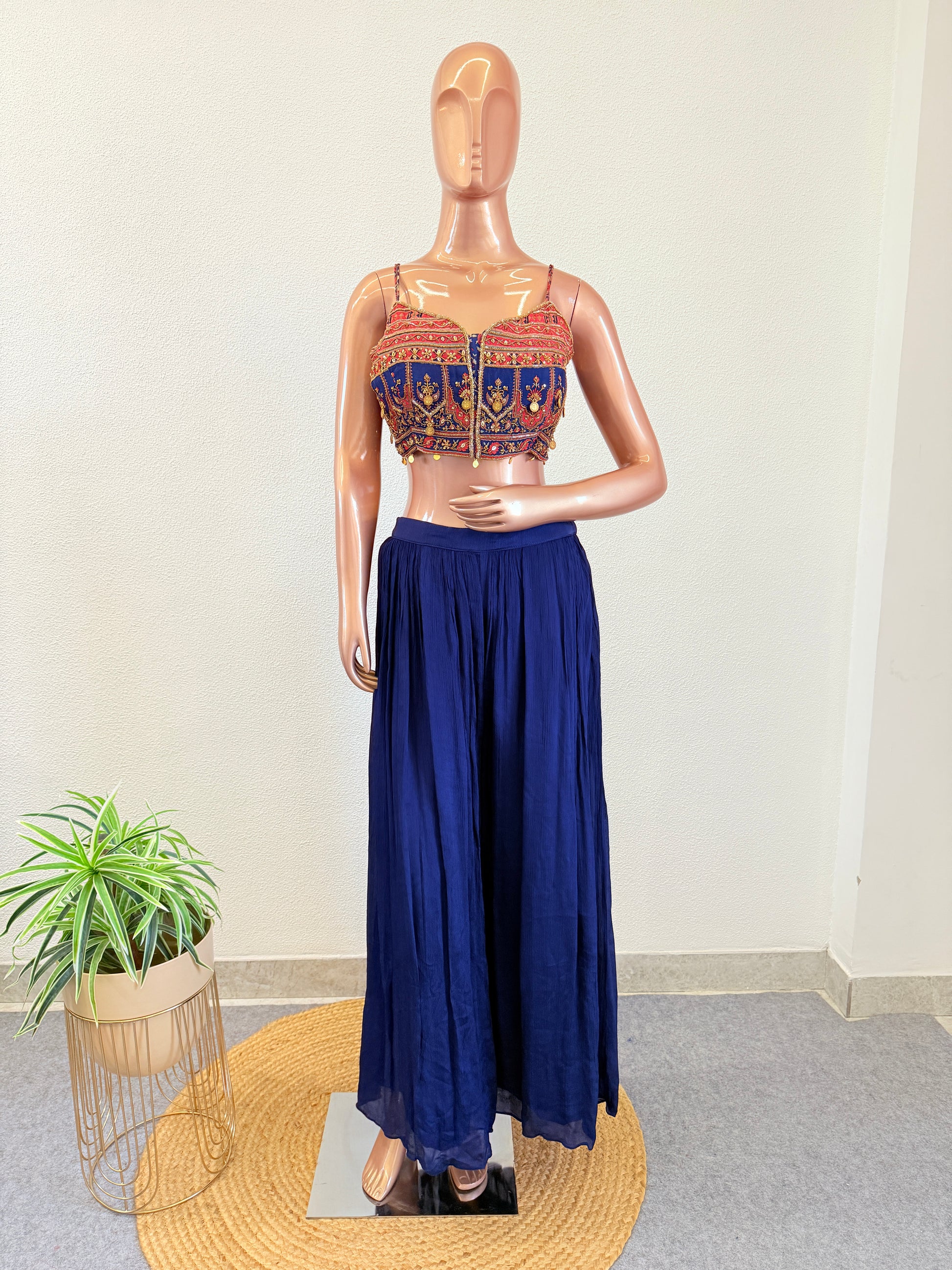Experience the elegant combination of traditional and modern with our Premium Chinon Indowestern set. This set features a solid palazzo and a paisley print crop top with delicate handwork and adjustable noodle straps. Complete the look with a long shrug for a premium outfit that will make you stand out.