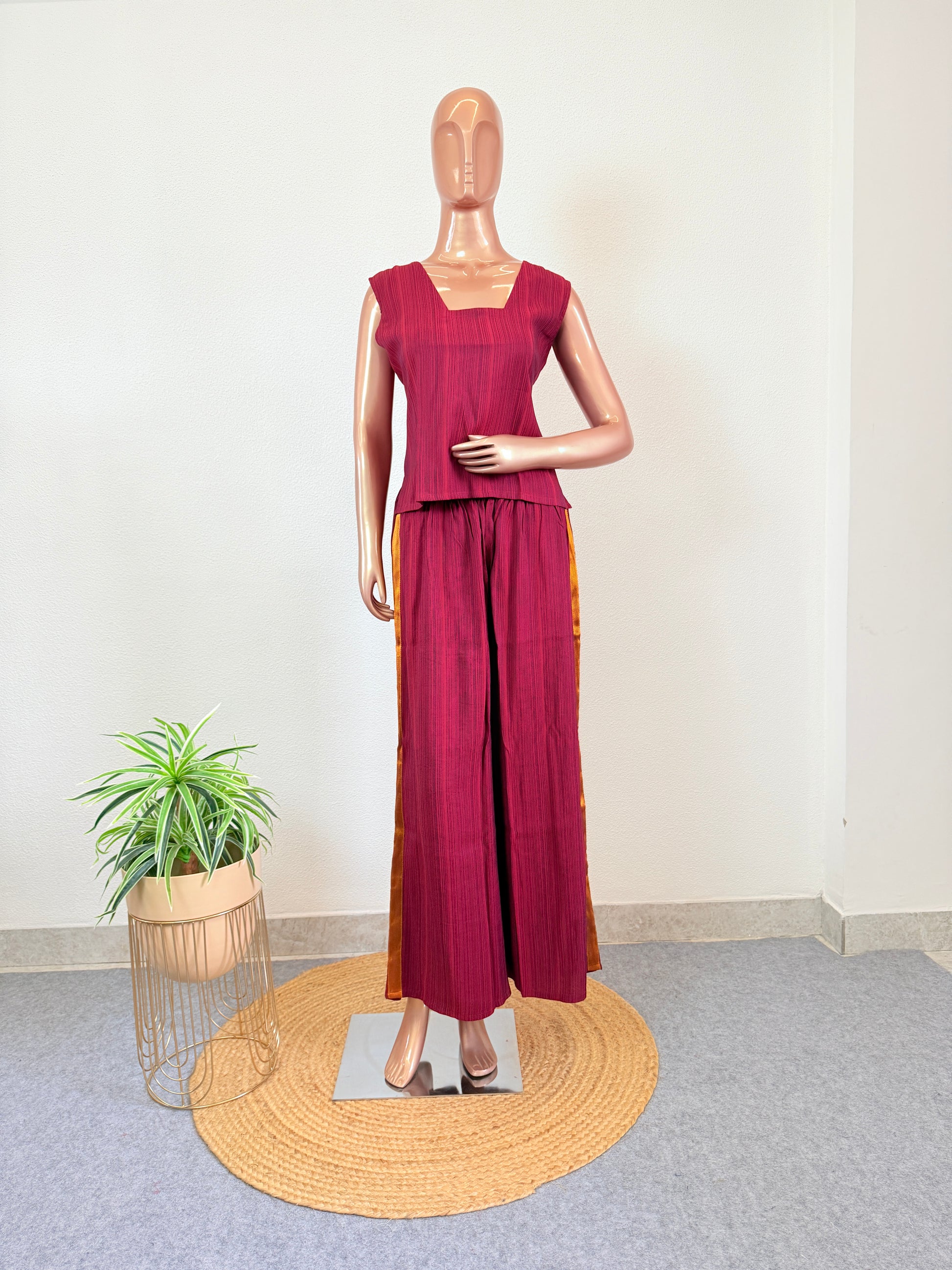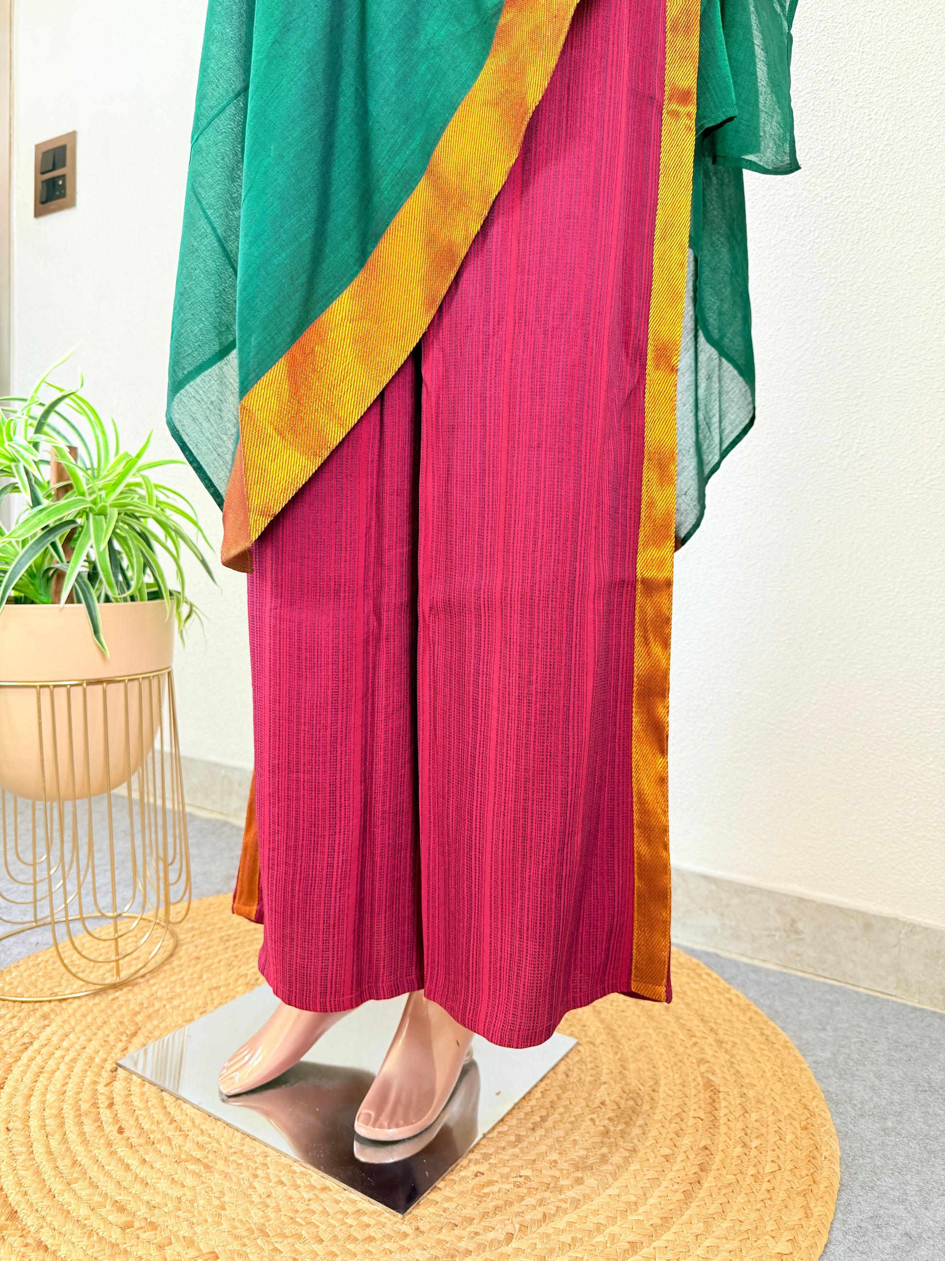 Elevate your ethnic wardrobe with this refined South cotton Indowestern ensemble. The collection features a gracefully draped short top paired with flowing wide-leg pants, complemented by a striking diagonal-cut cape-style overlay in contrasting hues. The sophisticated silhouette is enhanced by an exquisite neckpiece that adds an element of understated luxury. Crafted from breathable South cotton, this versatile set seamlessly blends traditional aesthetics with contemporary design, making it an ideal choice for festive occasions, celebrations, or elevated everyday wear.