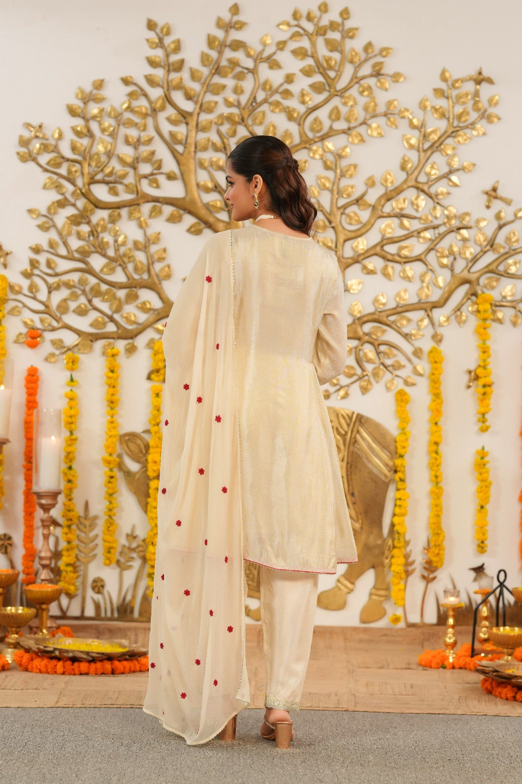 Elevate your wardrobe with this sophisticated Tissue Peplum Top and Pant Set. Crafted from soft tissue fabric, the kurta features a lining for comfort and showcases delicate embroidery on the yoke, complemented by subtle motifs throughout. The tailored peplum silhouette pairs elegantly with matching pants and a coordinating dupatta, creating a refined ensemble perfect for special occasions or stylish daytime events.