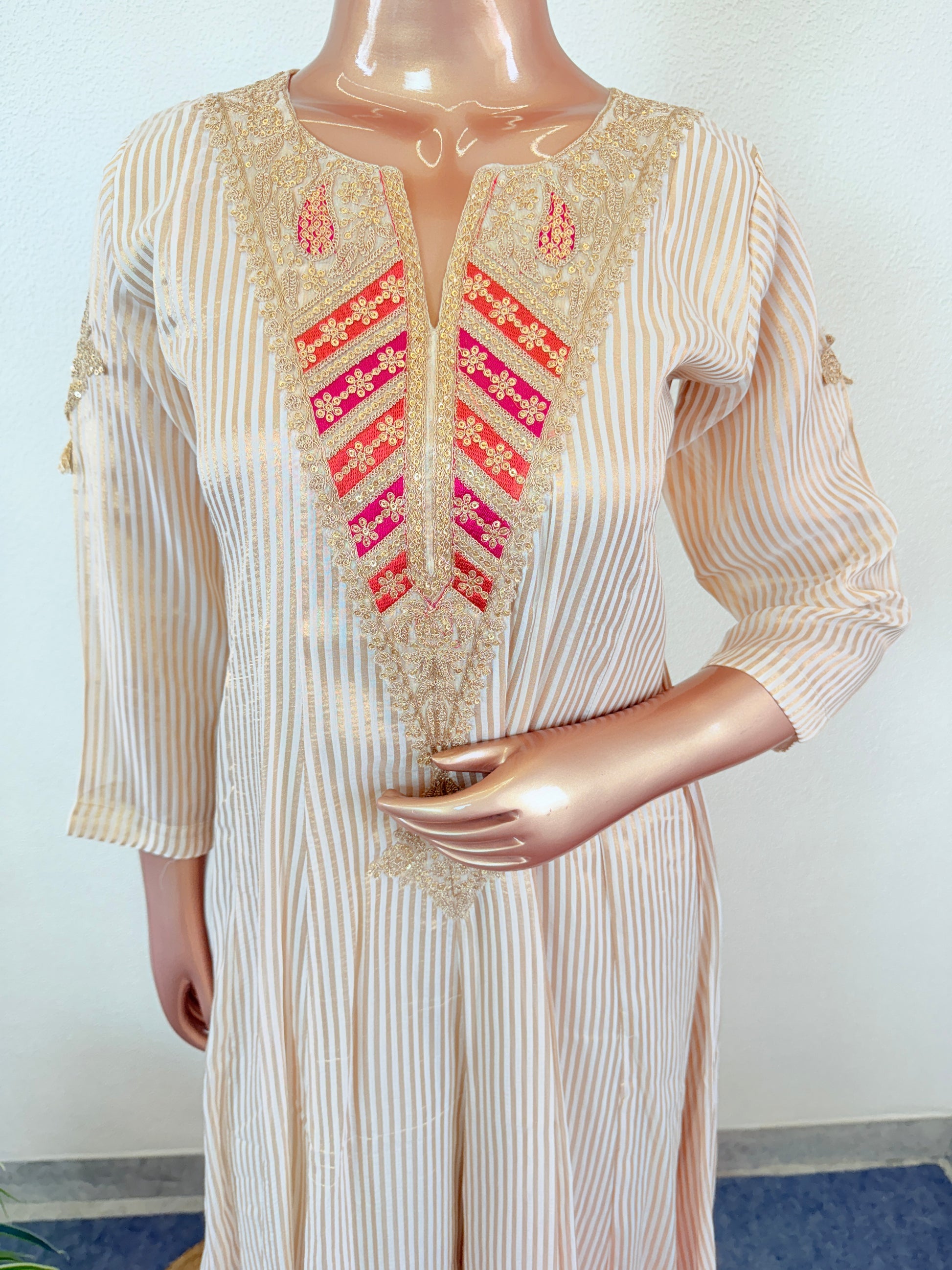 Elevate your ethnic wardrobe with this exquisite tissue suit set, crafted from premium soft shimmer fabric that drapes beautifully. The A-line silhouette features delicate zari work adorning the yoke, adding timeless elegance to your ensemble. Complete with attached lining for comfort and convenience, this set pairs seamlessly with a premium dupatta finished with striking contrast piping. Perfect for celebrations, gatherings, or special occasions where refined style speaks volumes.