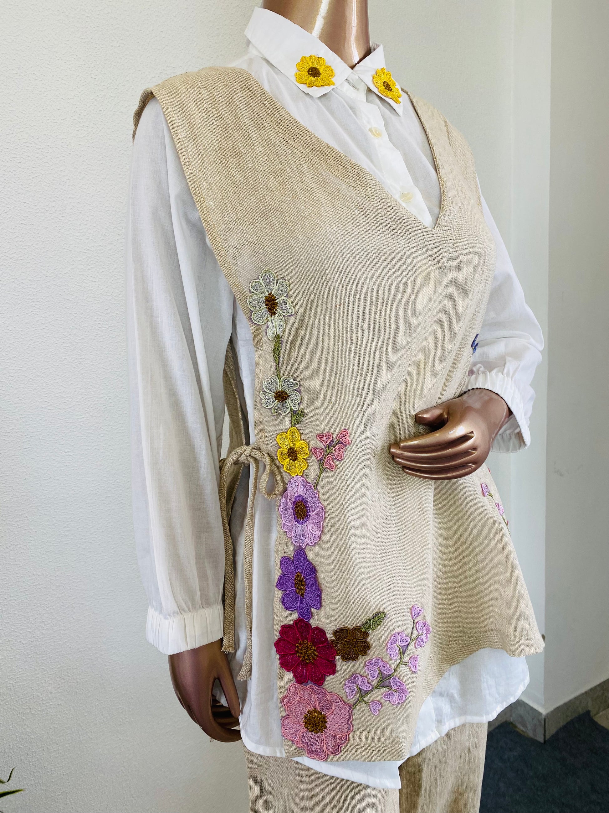Elevate your wardrobe with this sophisticated Jute Coord Set featuring a breathable mul cotton shirt adorned with long sleeves and a jute coverup detailed with exquisite 3D floral embroidery. Paired with matching jute pants, this ensemble blends natural textures and refined craftsmanship for a graceful, contemporary look. Perfect for occasions where understated elegance meets comfort.